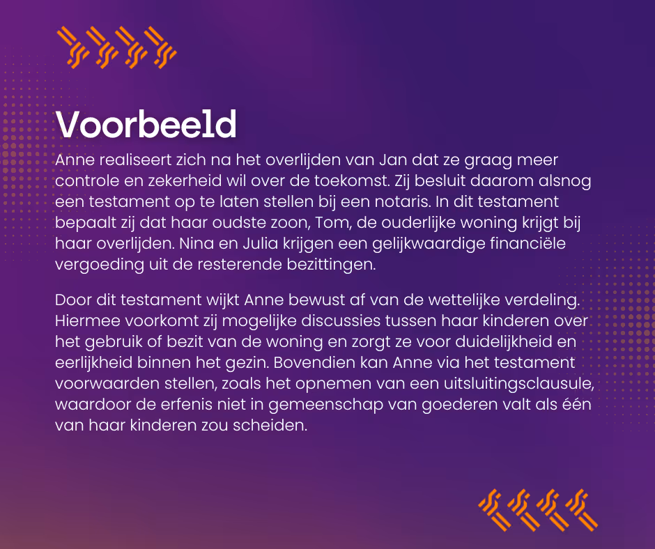 • Het beschermen van bepaalde bezittingen (zoals een onderneming of familiehuis) die je specifiek binnen de familie wilt houden.