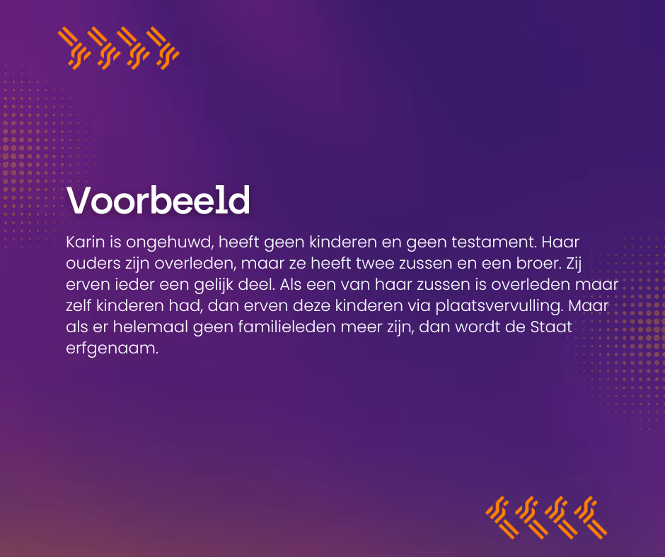 Als iemand overlijdt zonder partner of kinderen én zonder testament, is de wettelijke verdeling niet van toepassing. In dat geval treedt het versterferfrecht in werking, waarbij erfgenamen worden aangewezen op basis van vier wettelijke groepen (volgens artikel 4:10 BW):